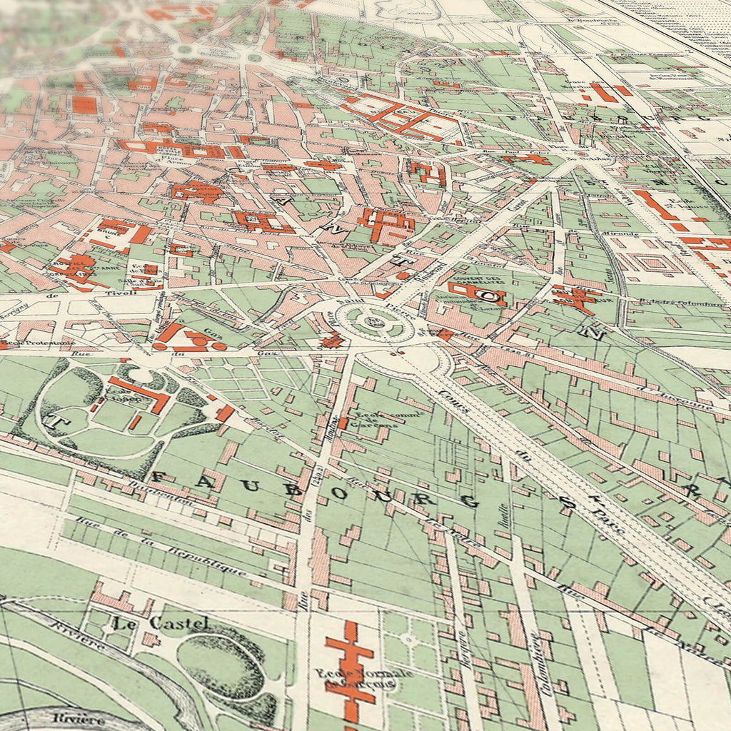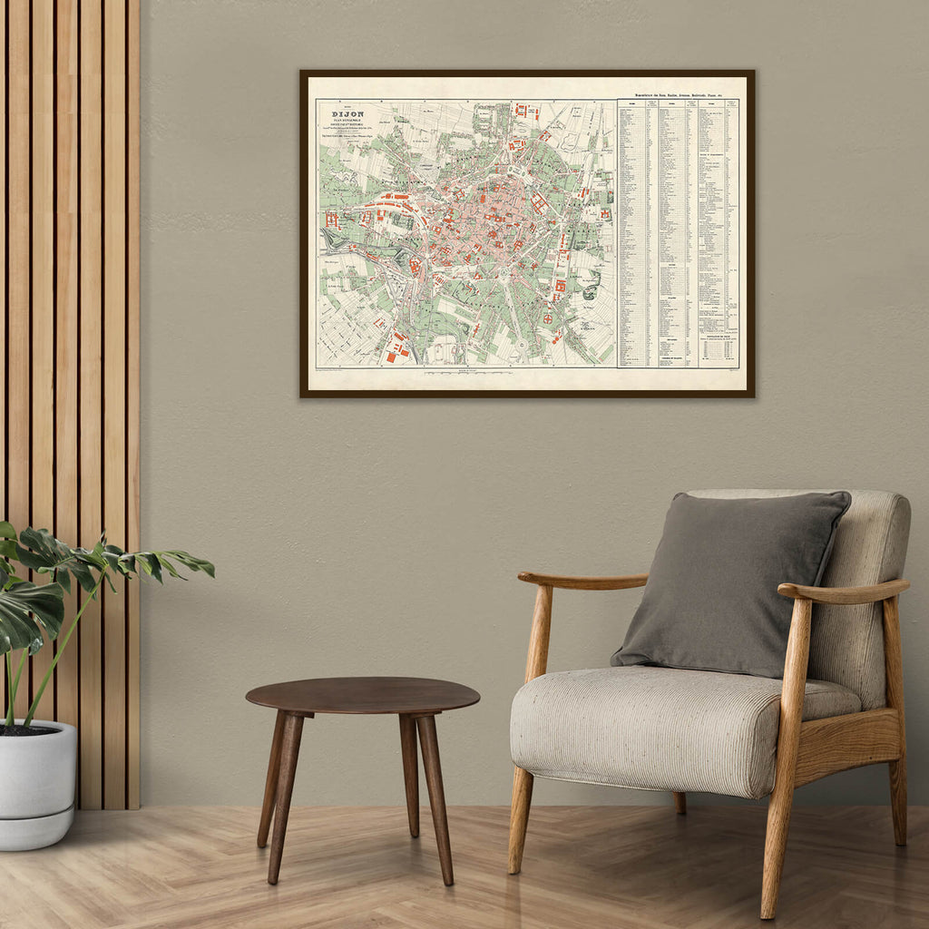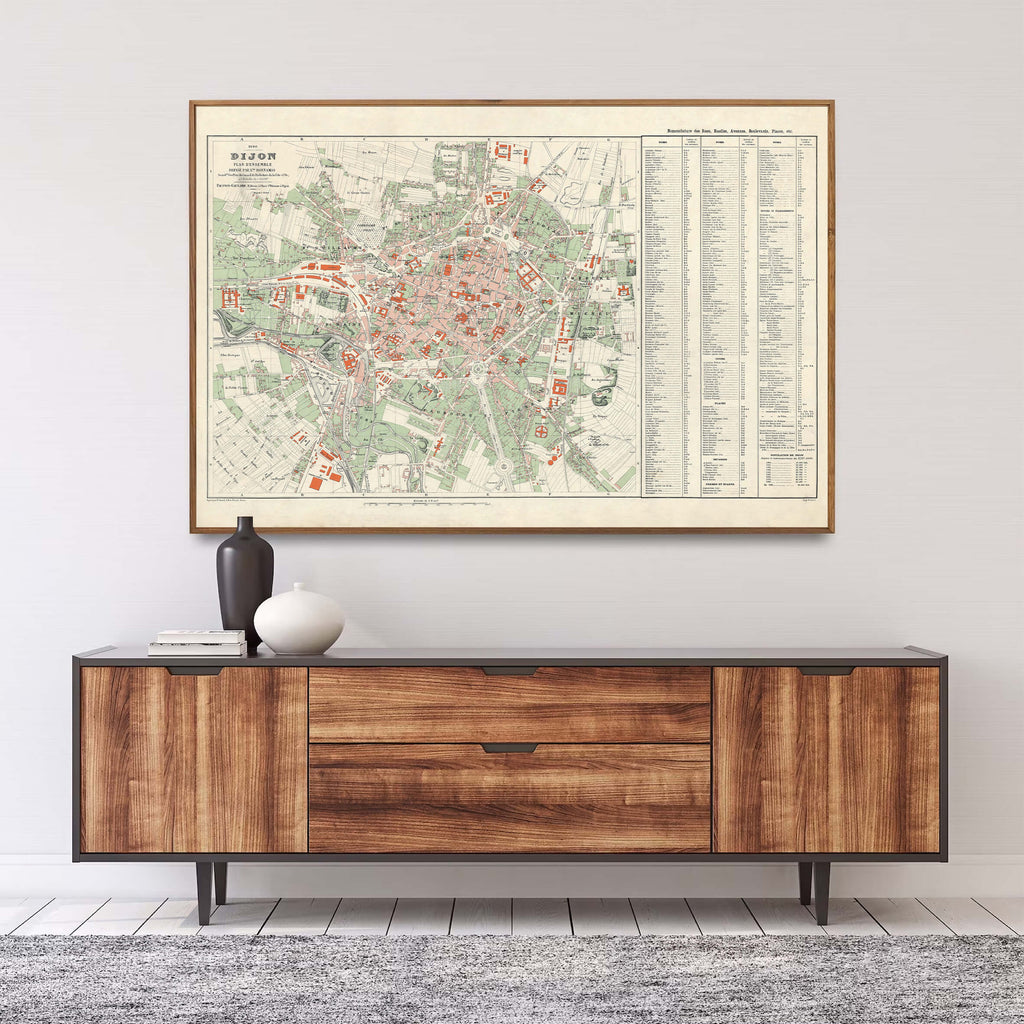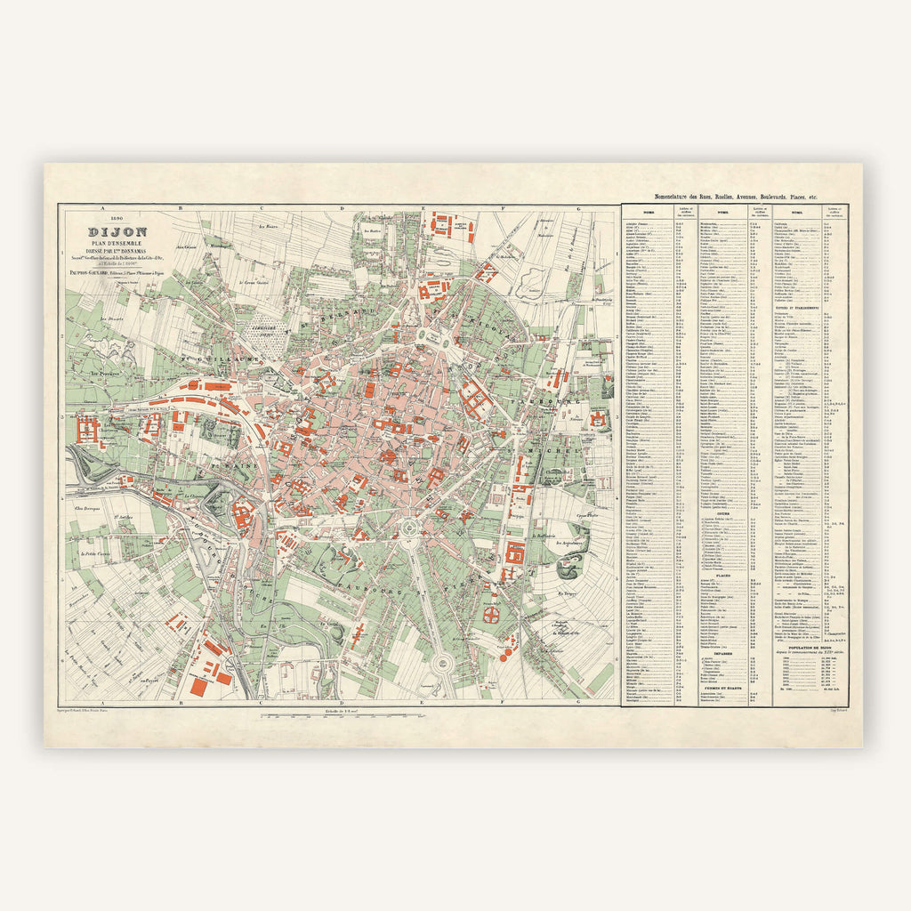 Cette carte géographique décorative illustre un plan d'ensemble de la ville de Dijon et nous éblouie par sa luminosité, ses couleurs, tout en restant patinée et vieillie.