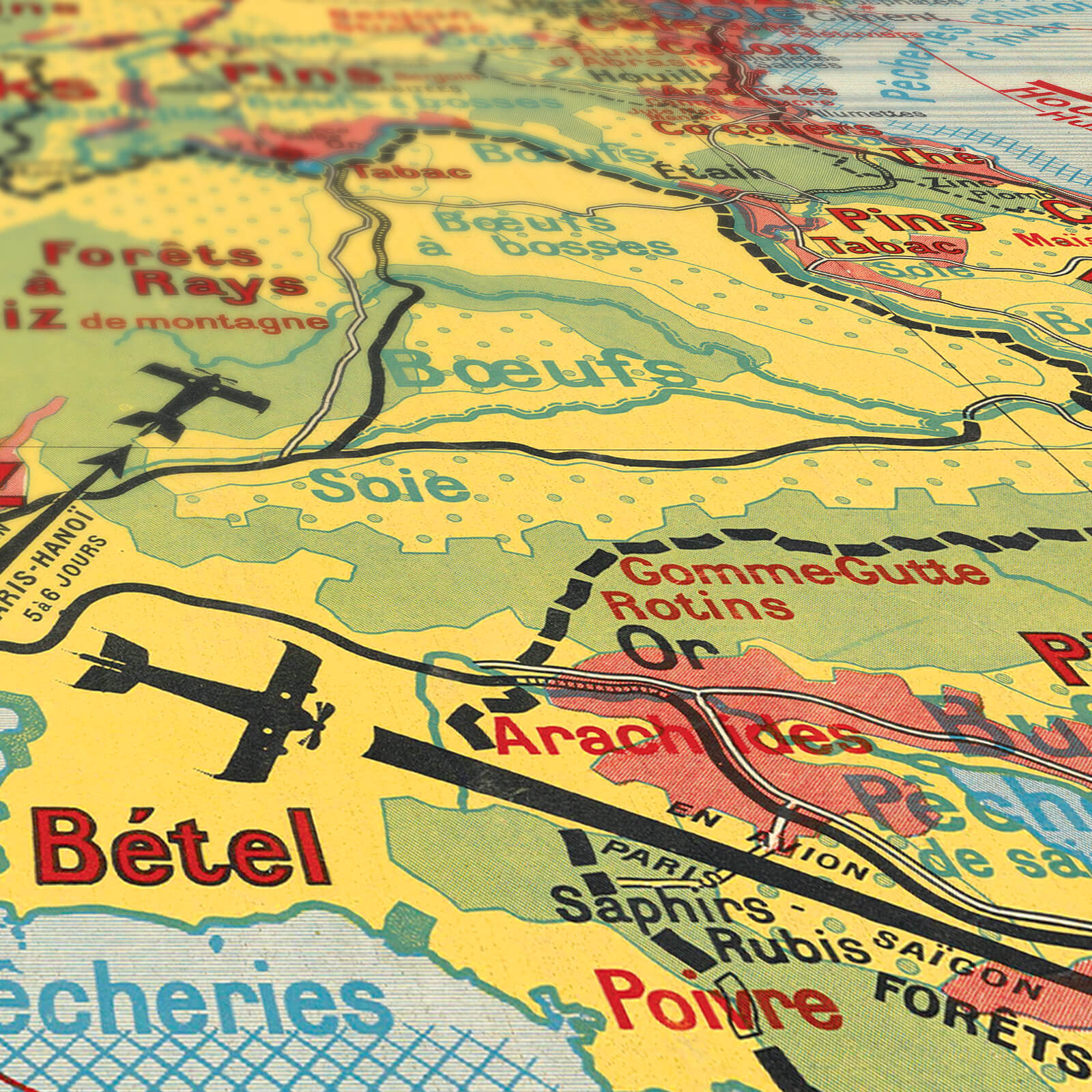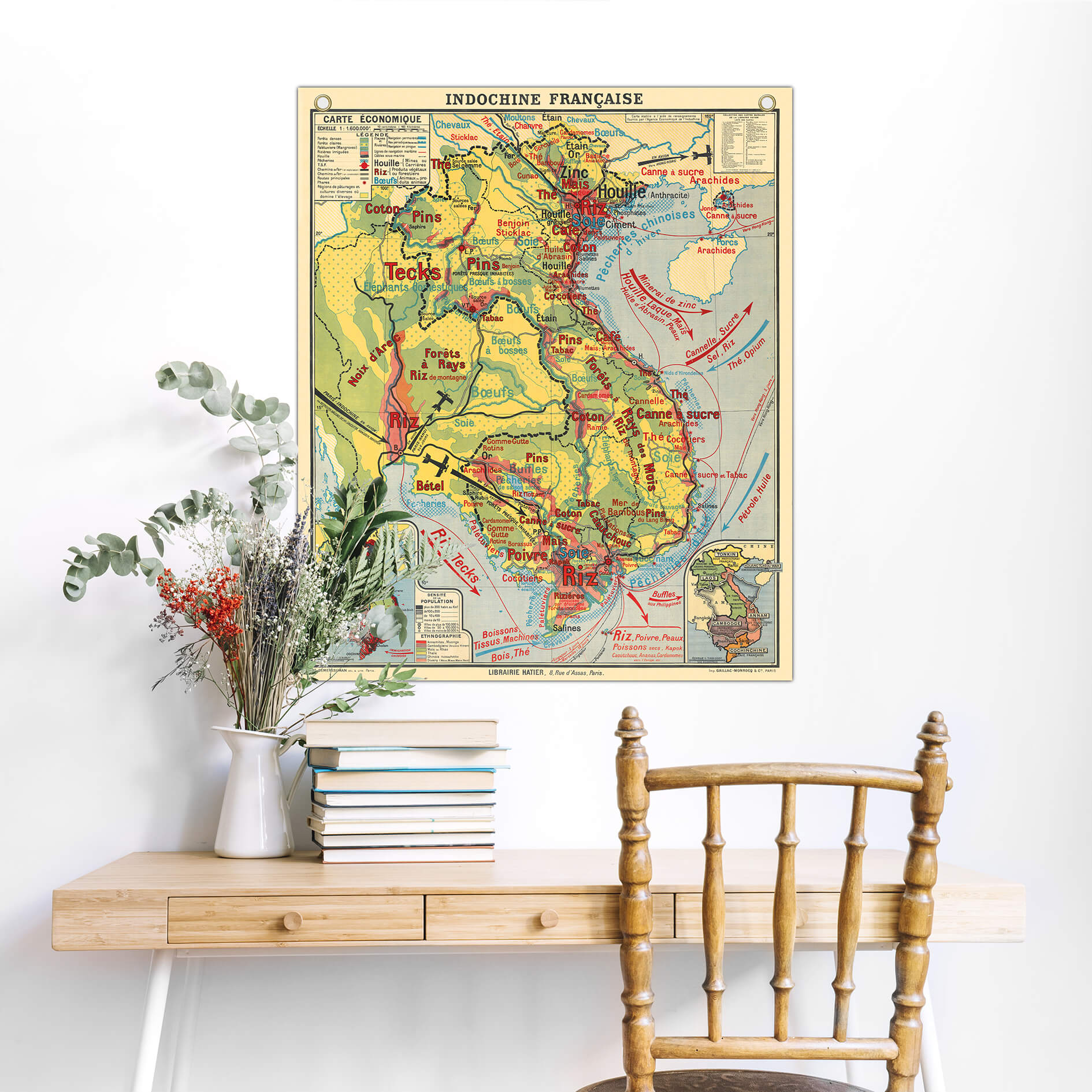 Offrez à votre intérieur une touche d’histoire avec cette magnifique carte scolaire économique de l’Indochine Française, reproduction fidèle d’un support pédagogique utilisé dans les écoles coloniales françaises au XXe siècle. Illustrant les ressources naturelles et les productions agricoles et industrielles des territoires indochinois (Vietnam, Laos, Cambodge), cette carte riche en couleurs et en détails vous transporte dans une époque marquante de l’histoire coloniale.