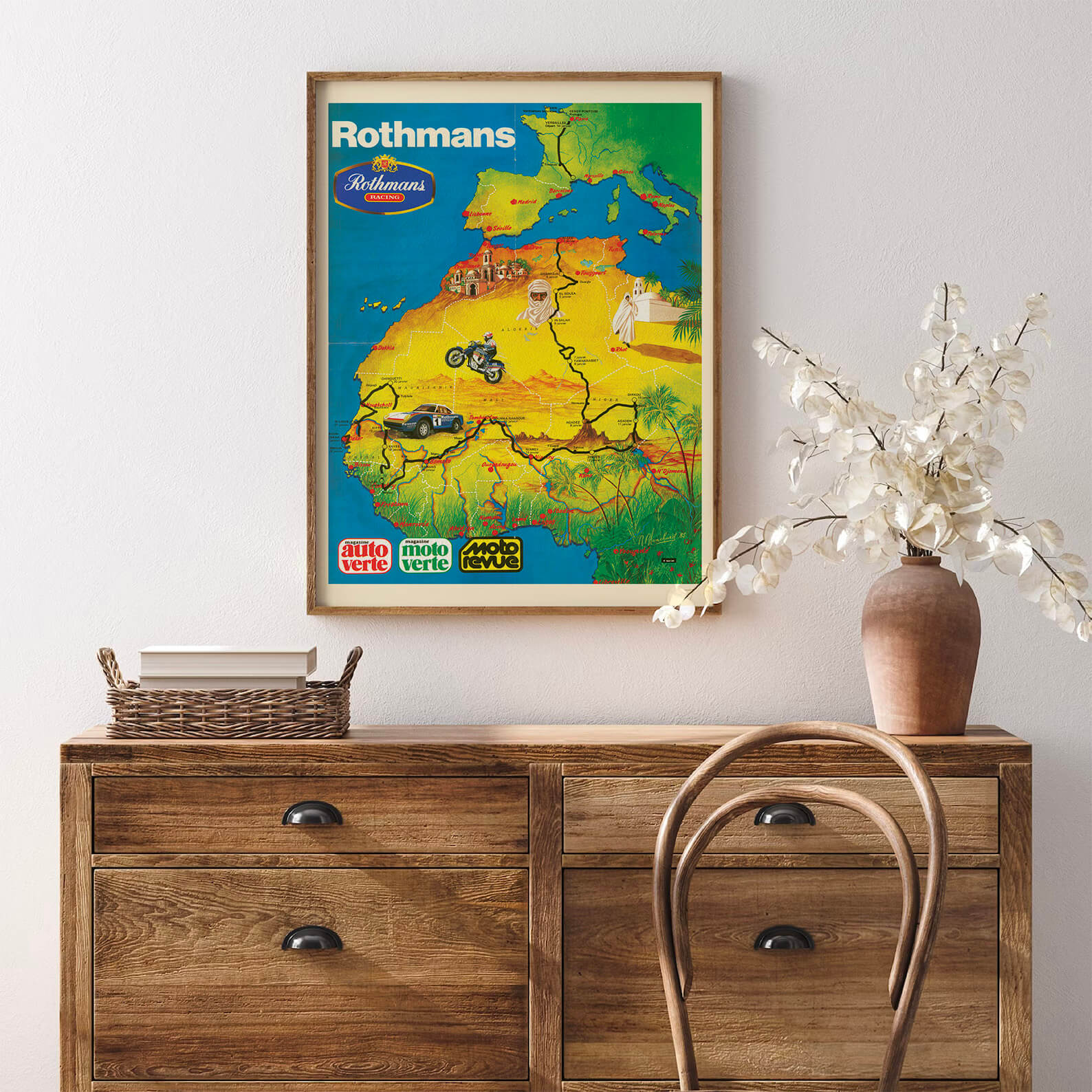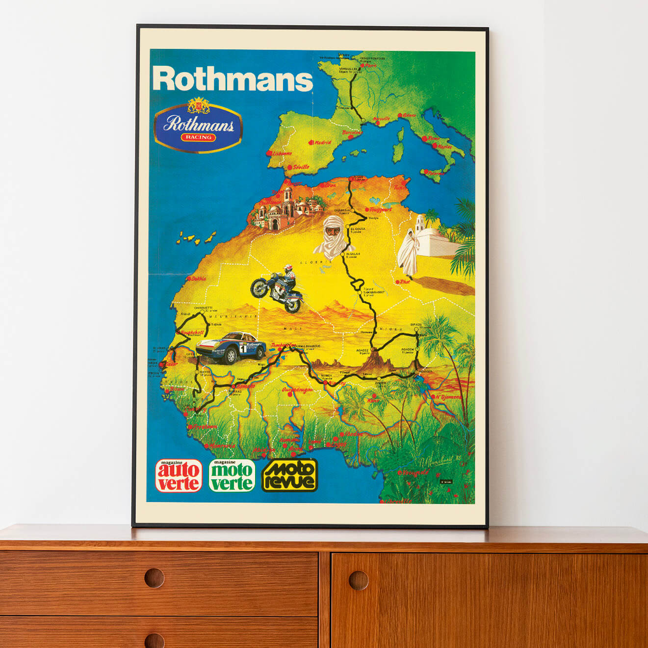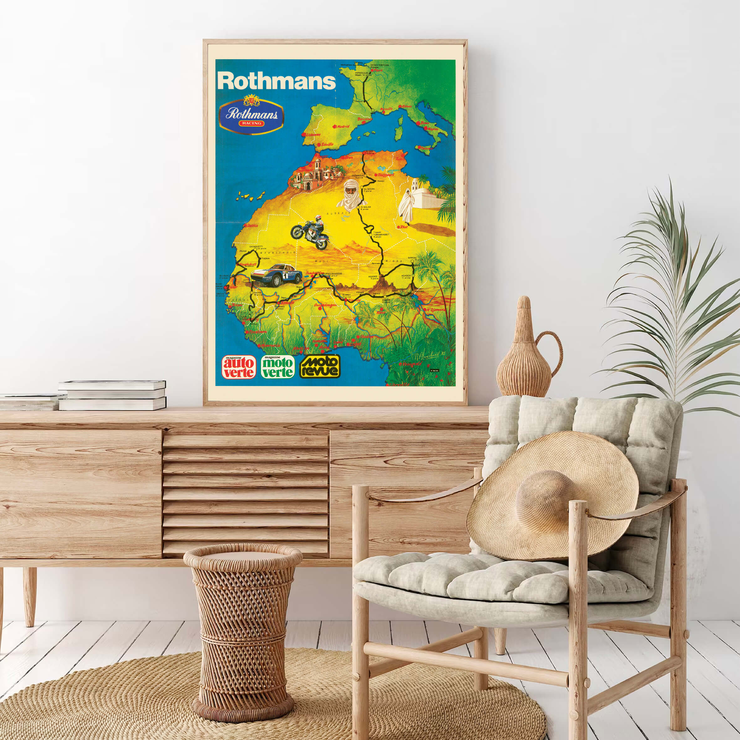 Mais cette carte ne séduit pas seulement par son contenu : son design graphique classique reflète l’esthétique des années 1980, avec une mise en page dynamique, des lignes route tracées avec précision et des typographies vintage qui racontent l’époque où l’esprit du rallye se mêlait à celui de l’aventure. Chaque courbe, annotation et couleur fait de ce poster une pièce de collection idéale à encadrer, parfaite pour décorer un salon, un garage ou un bureau.
