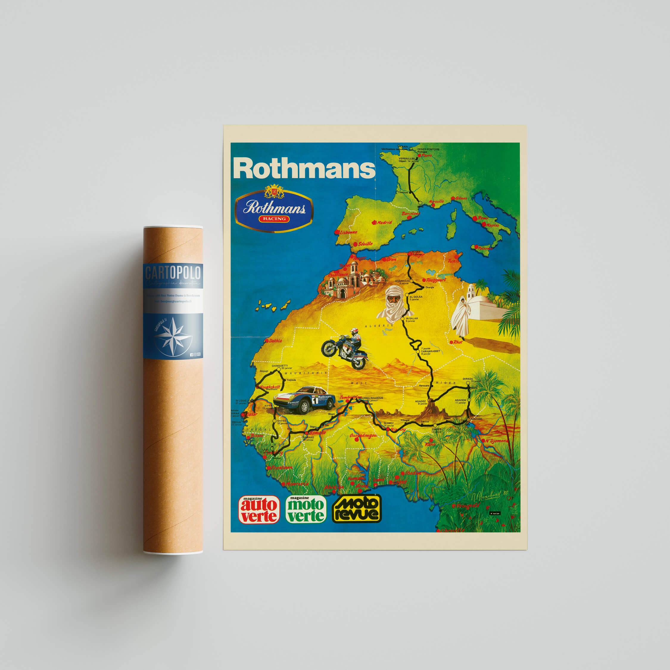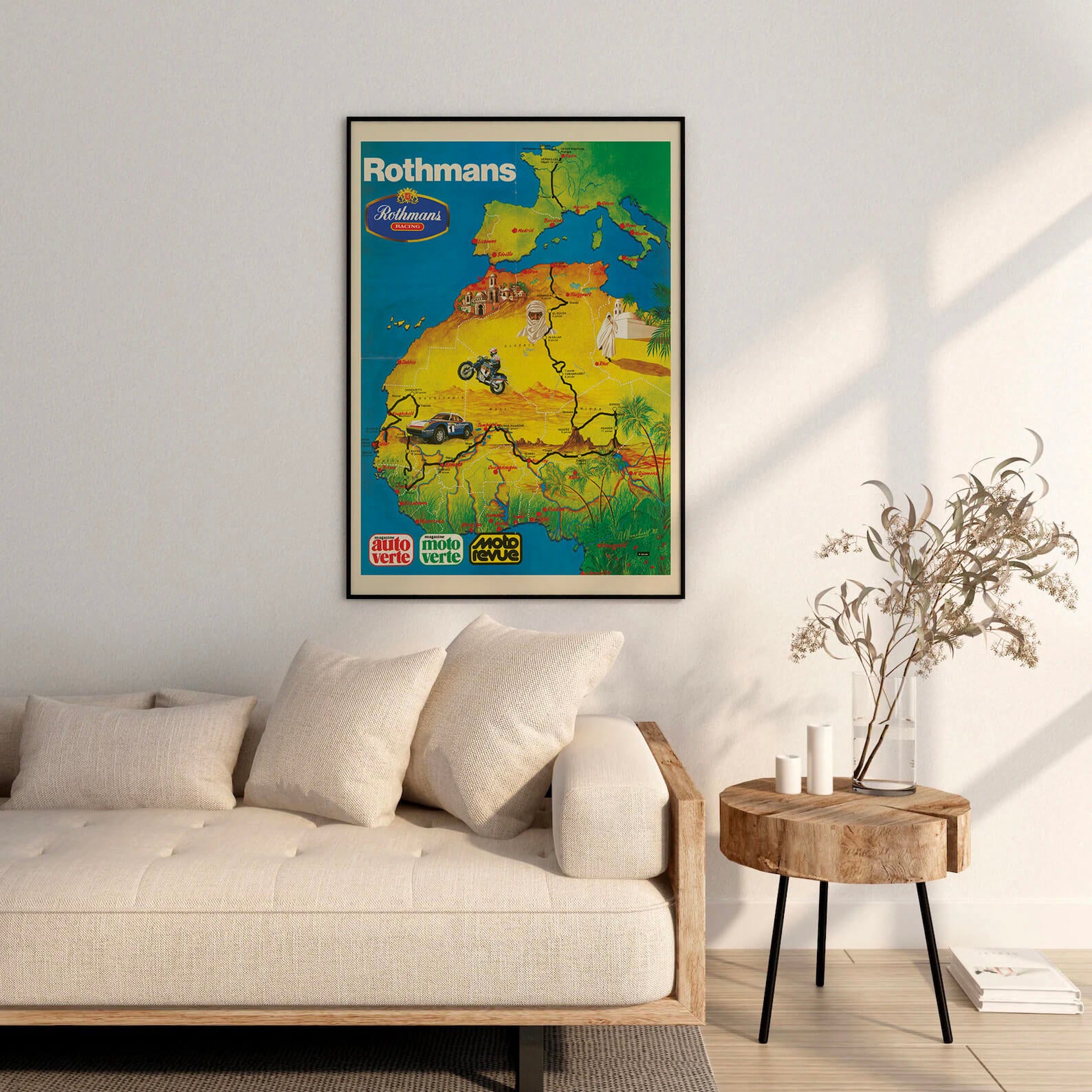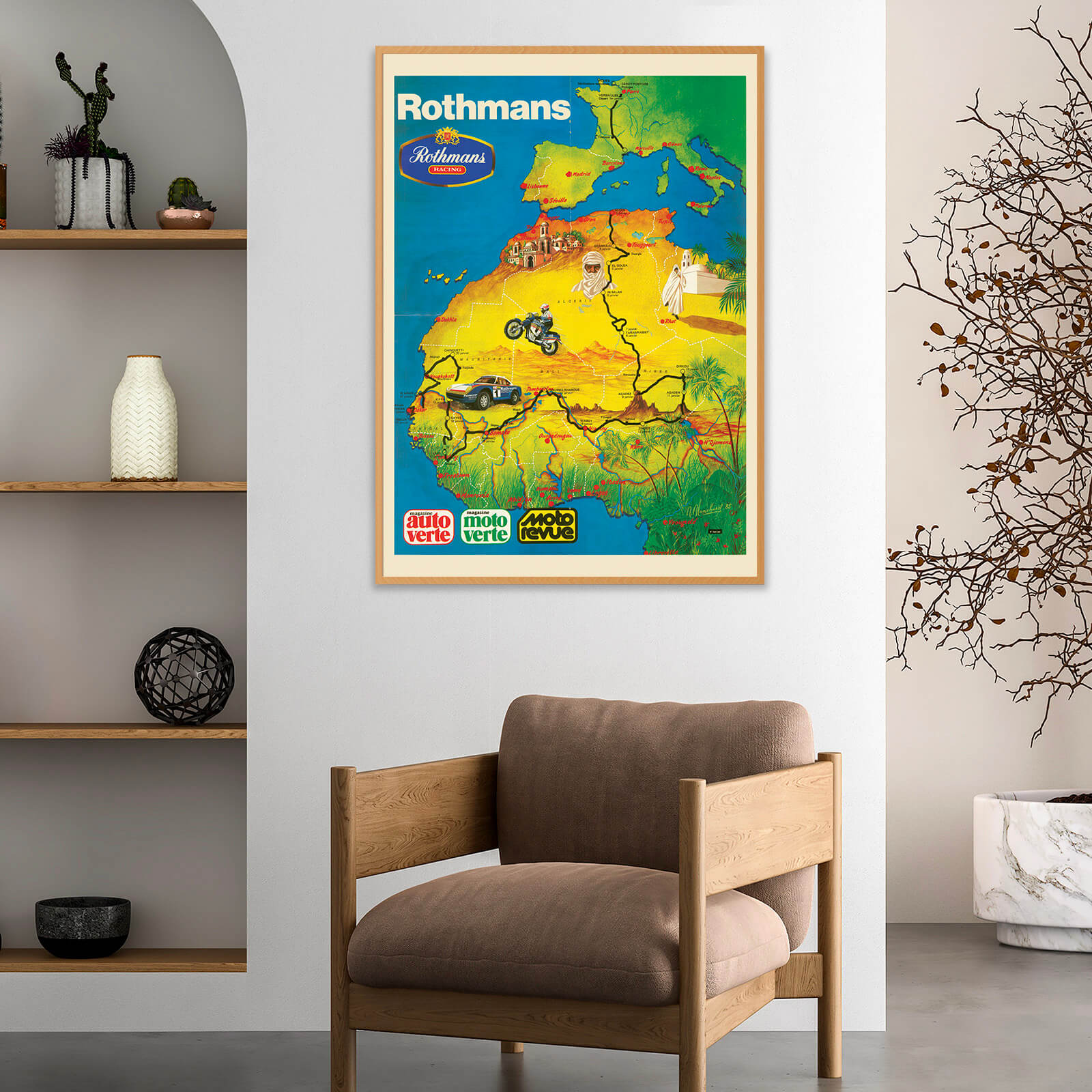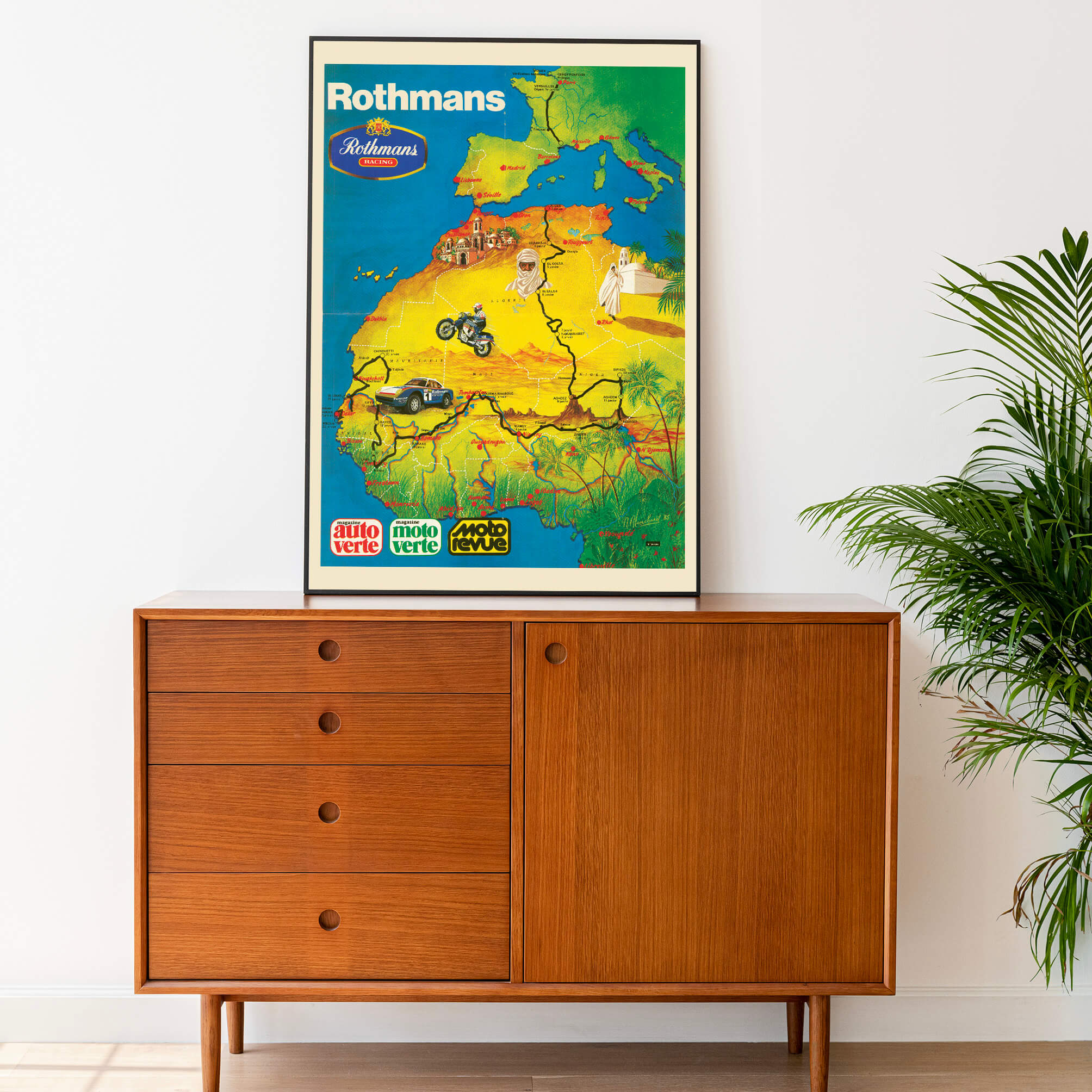 Mais cette carte ne séduit pas seulement par son contenu : son design graphique classique reflète l’esthétique des années 1980, avec une mise en page dynamique, des lignes route tracées avec précision et des typographies vintage qui racontent l’époque où l’esprit du rallye se mêlait à celui de l’aventure. Chaque courbe, annotation et couleur fait de ce poster une pièce de collection idéale à encadrer, parfaite pour décorer un salon, un garage ou un bureau.