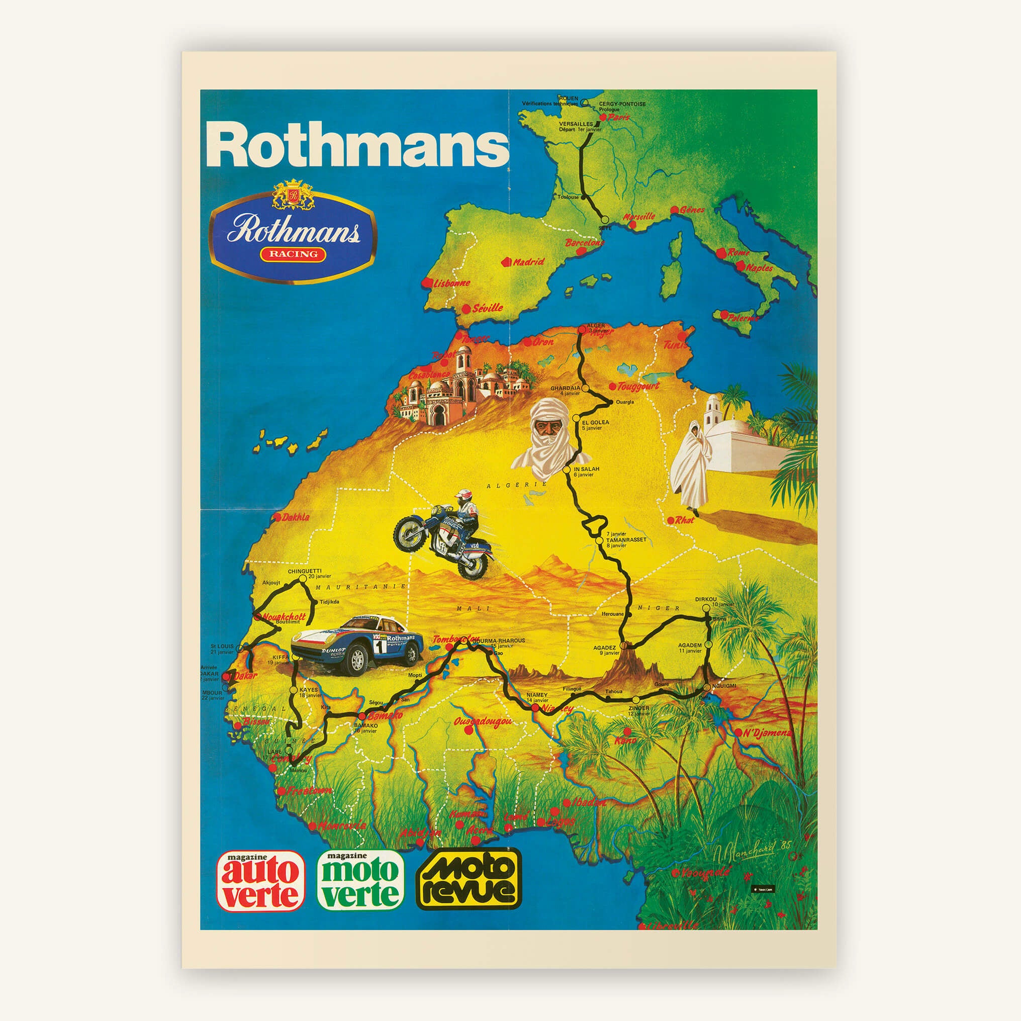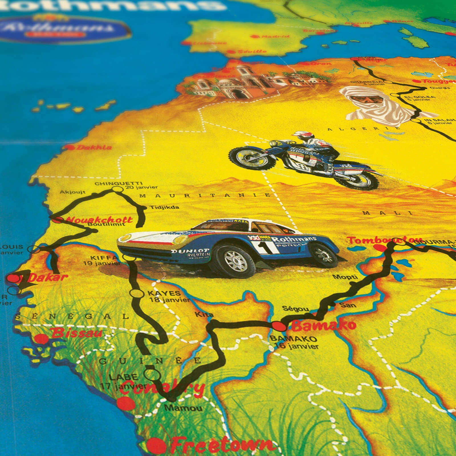 Sur ce grand format illustré, la route légendaire se déploie depuis Paris, traverse l’Europe pour rejoindre l’Afrique du Nord, puis s’enfonce au cœur du désert jusqu’à Dakar au Sénégal. Le tracé met en évidence des sections de dunes, de pistes caillouteuses et de vastes étendues sahariennes qui ont fait la réputation de la course pour sa difficulté redoutable. Une anecdote géographique : les concurrents de 1986 durent affronter un mélange de terrains aussi variés qu’impitoyables, depuis les pierriers de l’Algérie jusqu’aux plaines du Sahel, un défi qui transformait chaque kilomètre en une épreuve d’endurance et de navigation.