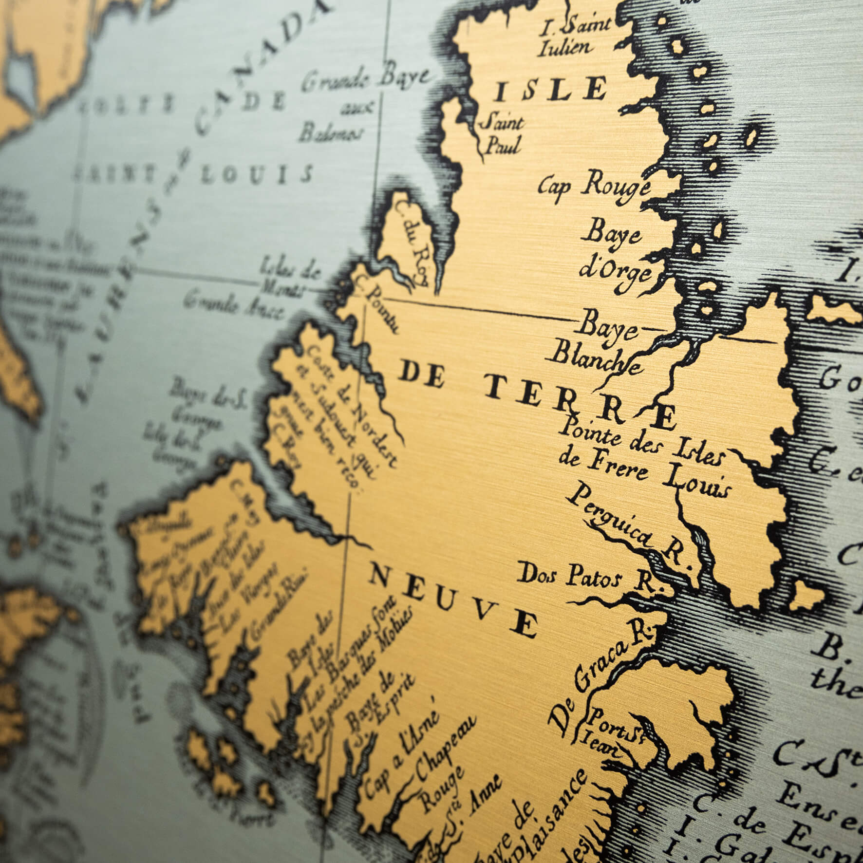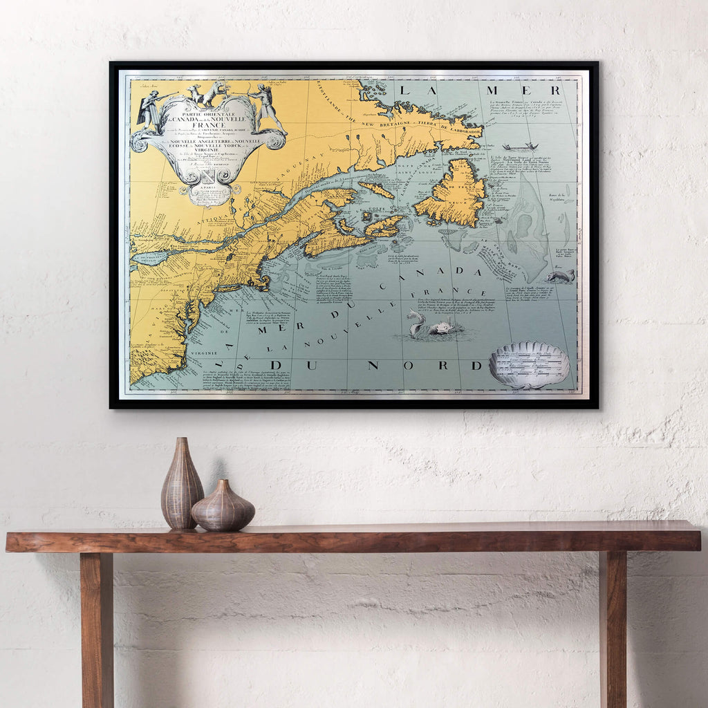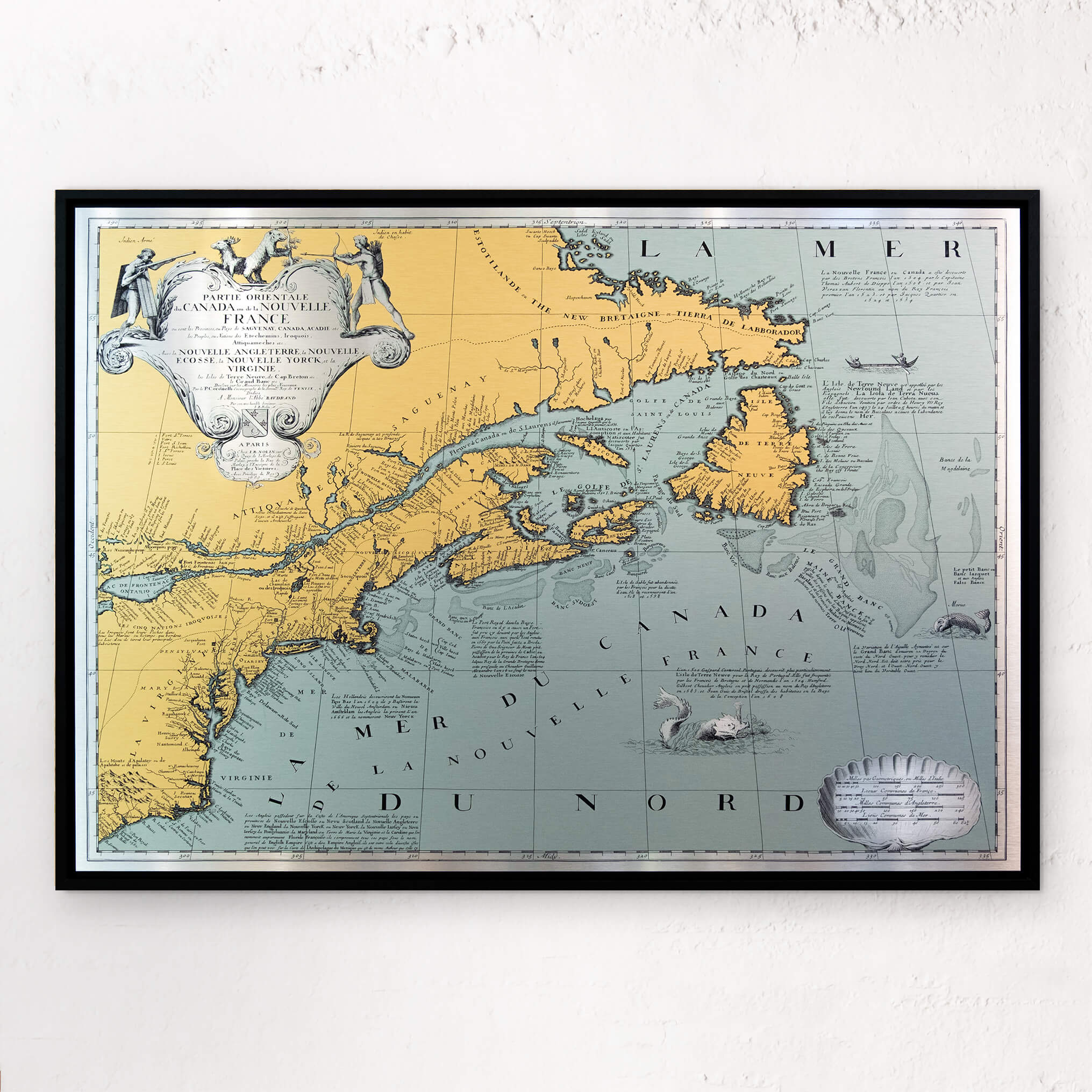 Ce tableau n'est pas qu'une simple décoration; c'est un fragment d'histoire. La carte représente la "Partie Orientale du Canada ou Nouvelle-France" telle qu'elle était perçue à l'époque, englobant la Nouvelle-Écosse, la Nouvelle-Angleterre, la Nouvelle-York, la Virginie, et les vastes territoires de l'Acadie, du Canada et de la Baie d'Hudson (Terre de Labrador).